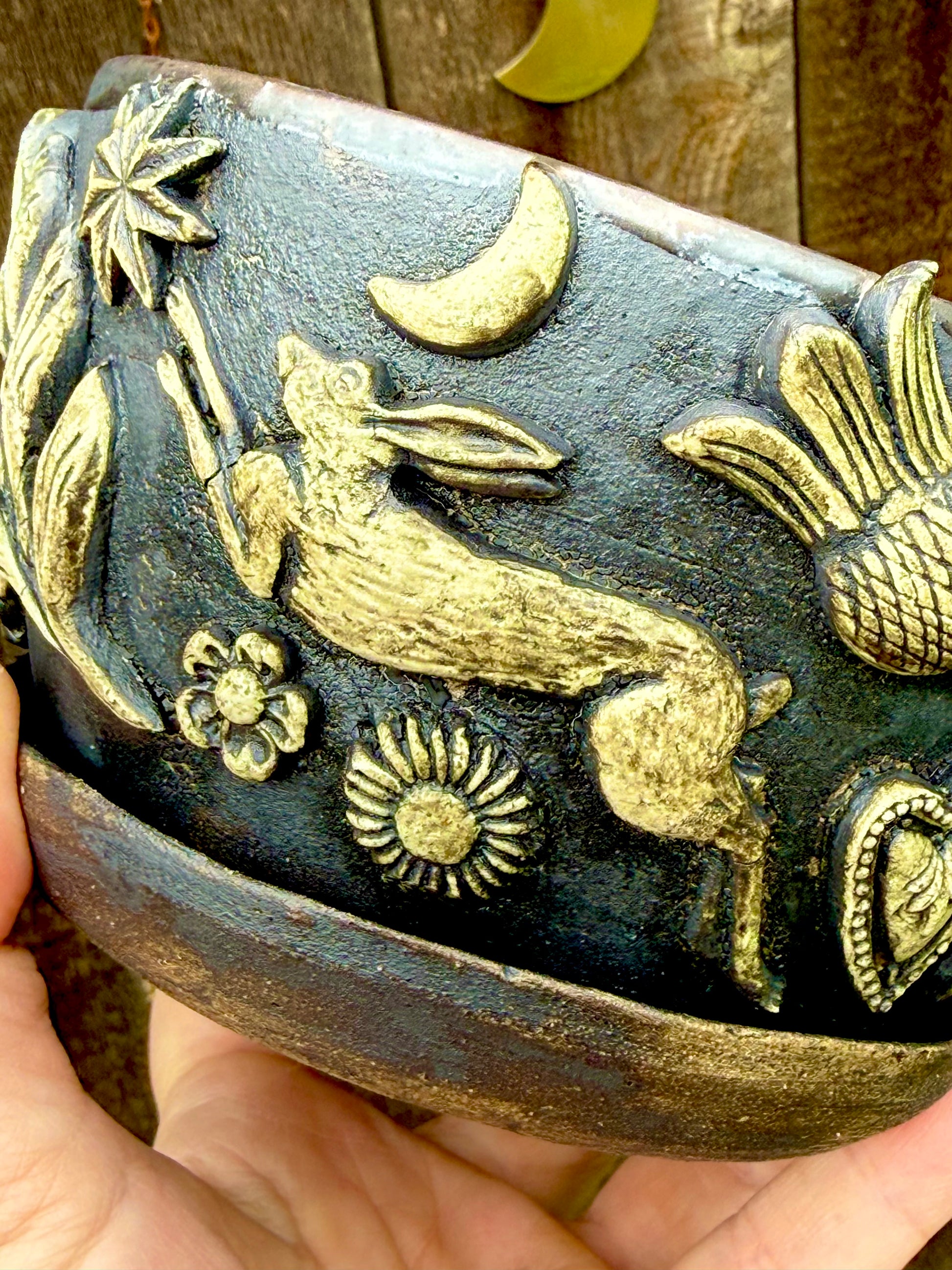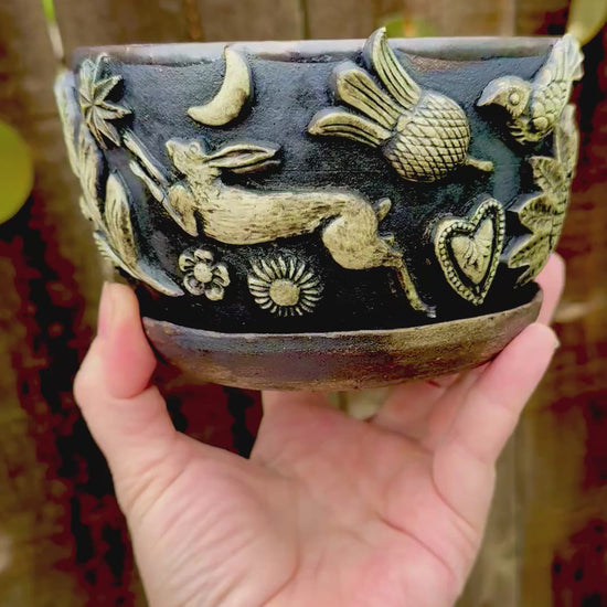 Hand-thrown on the wheel and finished in layered, earthy glazes, these ceramic planters carry the feel of old-world craft and forest symbolism. Each piece is shaped by hand and adorned with raised botanical and folkloric elements—moths, moons, serpents, and woodland forms—bringing a quiet, grounded presence to any space.